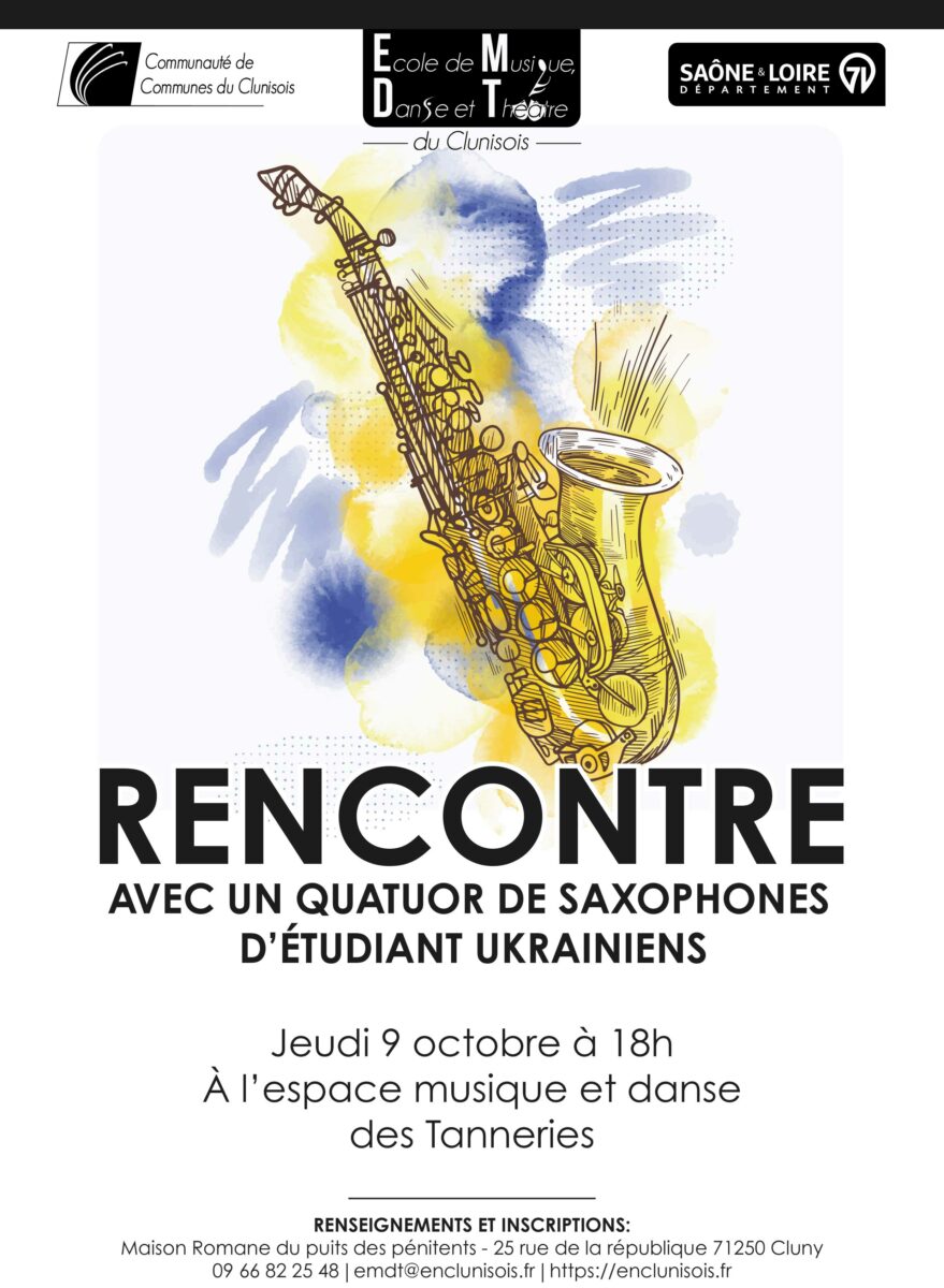 Les participants pourront découvrir et échanger avec un quatuor de saxophones d’étudiants ukrainiens, en résidence dans le clunisois. Cette rencontre s’inscrit dans la volonté de l’école d’encourager les échanges culturels et de faire vivre la musique sous toutes ses formes.
