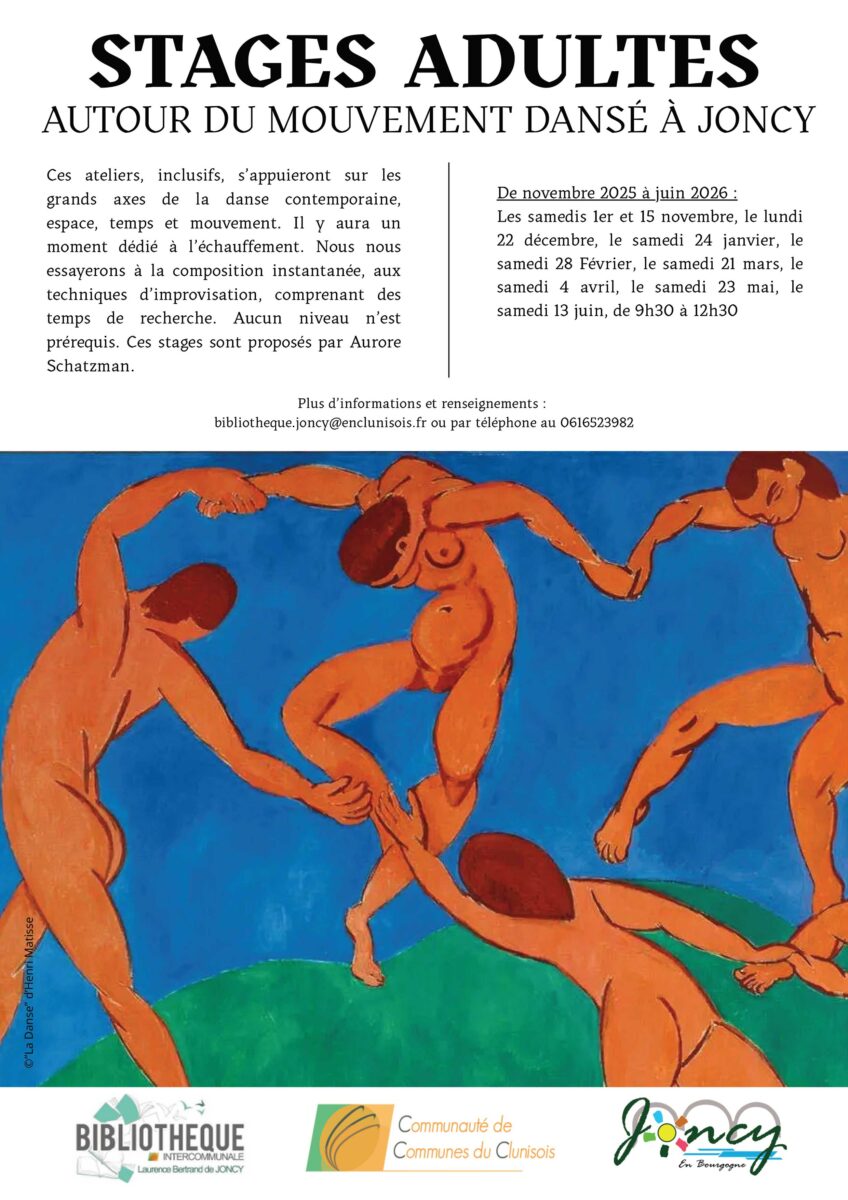 La bibliothèque intercommunale Laurence Bertrand de Joncy propose, de novembre 2025 à juin 2026, une série de stages de danse contemporaine animés par Aurore Schatzman.