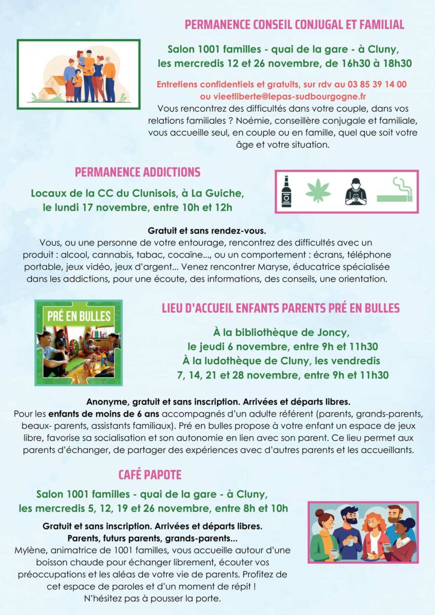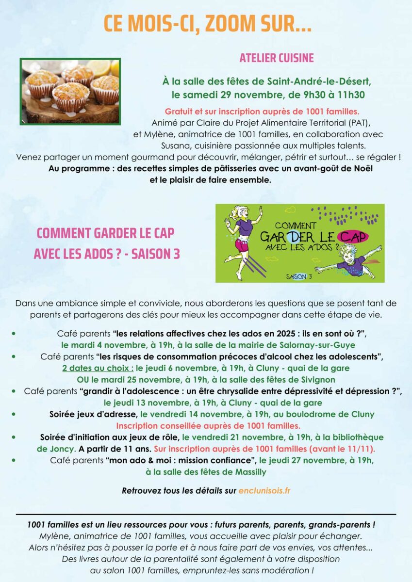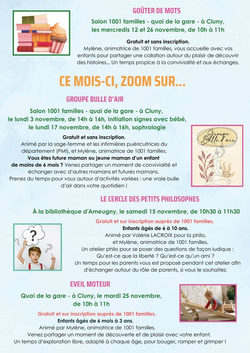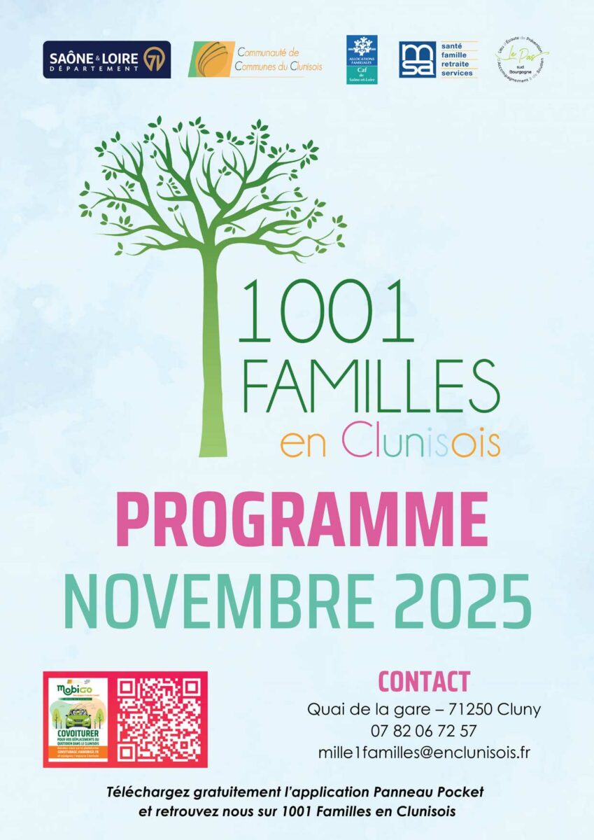 1001 Familles en clunisois, propose un éventail d’activités et de permanences pour les familles, les enfants et les jeunes du territoire. Voici le programme détaillé pour le mois de novembre 2025 :