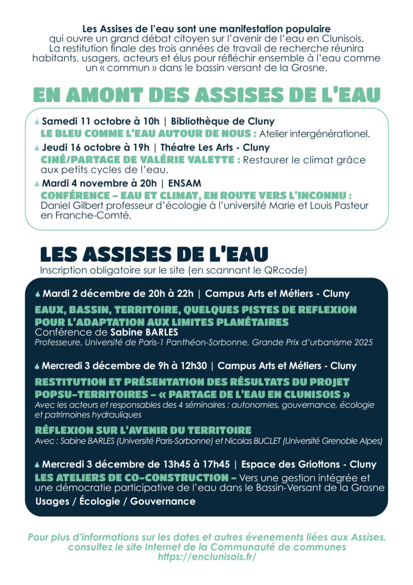 - Mardi 2 décembre – 20h à 22h, Campus Arts et Métiers de Cluny Conférence de Sabine Barles (Université Paris 1 Panthéon-Sorbonne, Grand Prix d’urbanisme 2025) : « Eau, bassin, territoire : pistes pour l’adaptation aux limites planétaires »