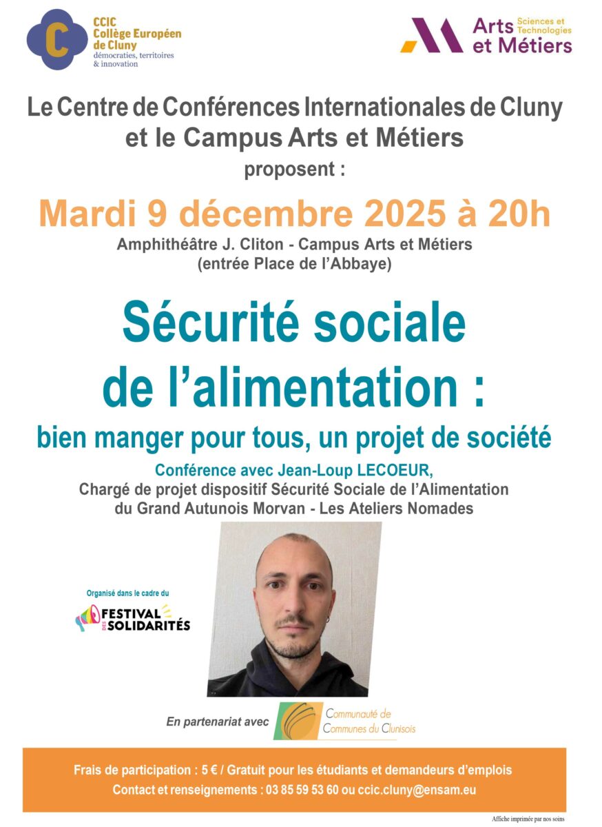 Dans le cadre du Festival des Solidarités et en lien avec le Projet Alimentaire Territorial du Clunisois, une conférence sur la sécurité sociale de l’alimentation aura lieu mardi 9 décembre prochain au CCIC-Collège Européen de Cluny.