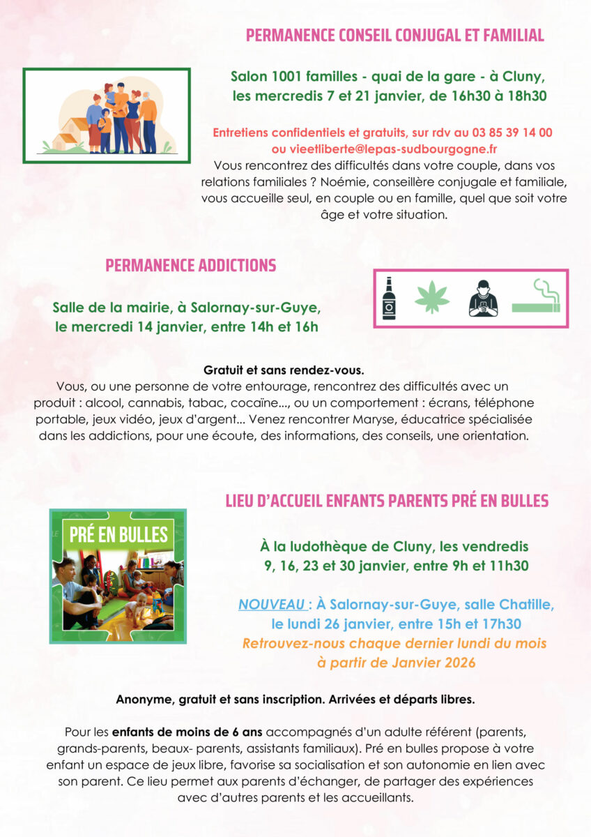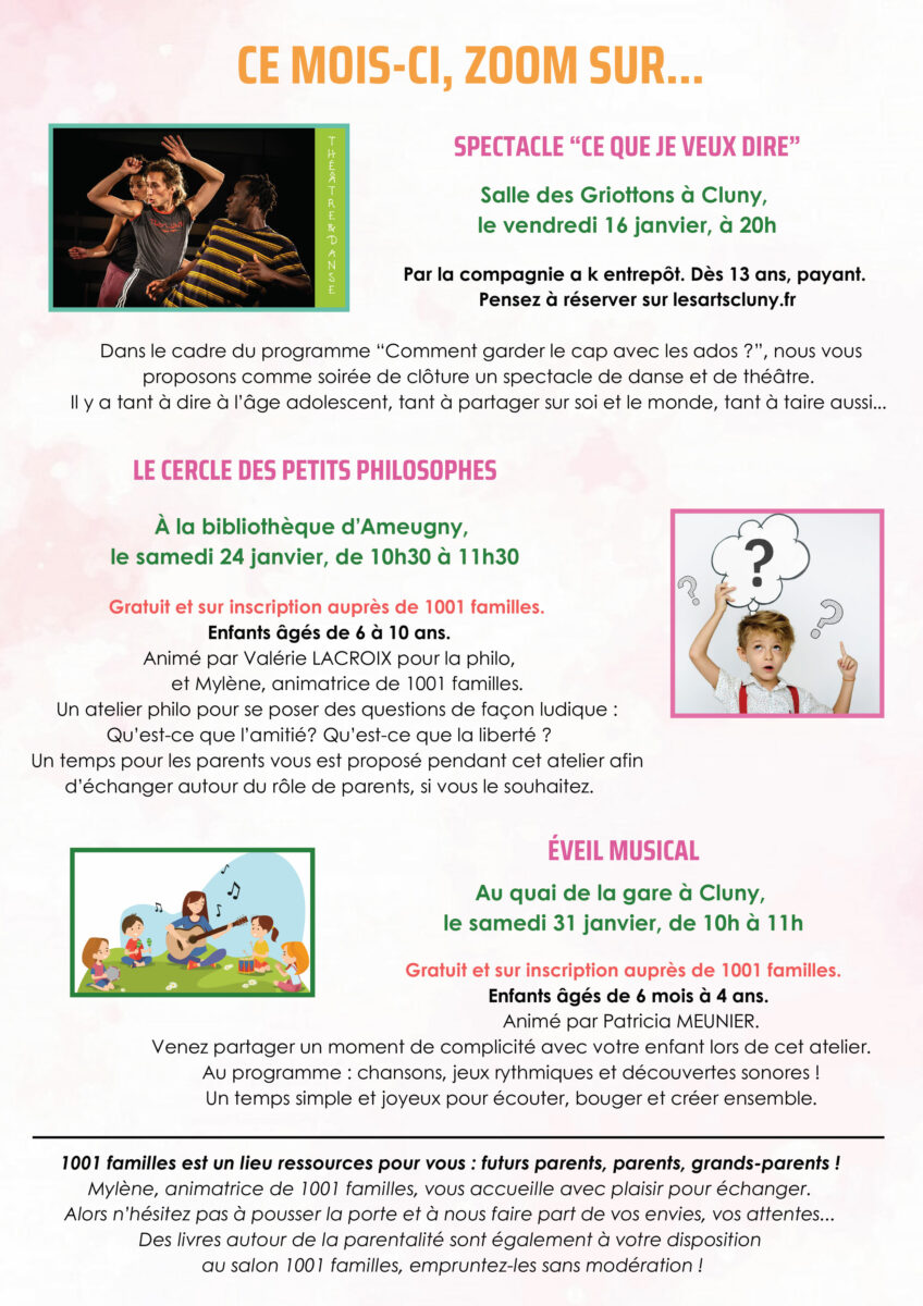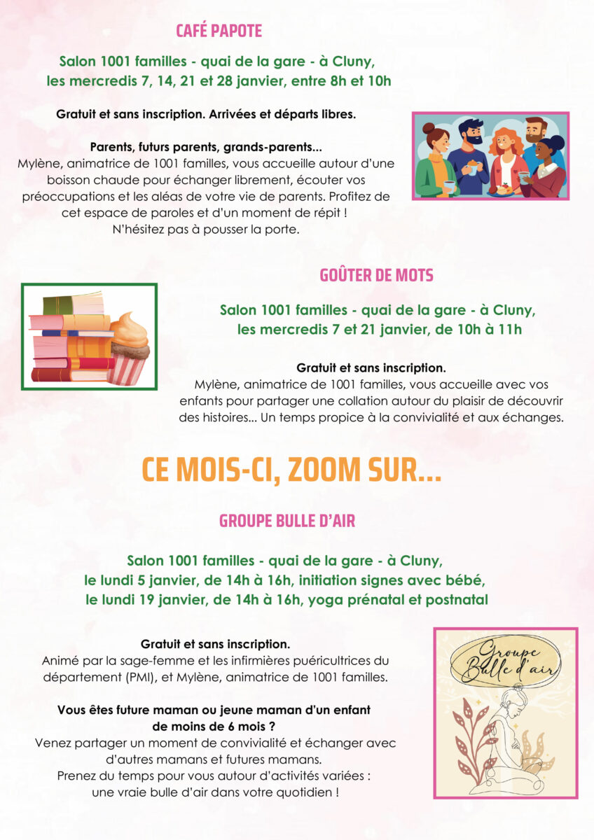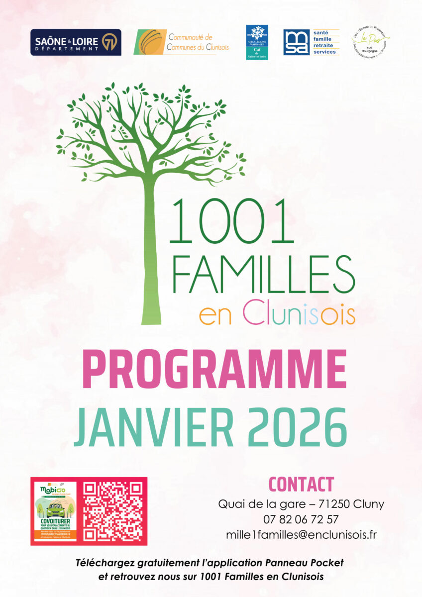1001 Familles en clunisois, propose un éventail d’activités et de permanences pour les familles, les enfants et les jeunes du territoire. Voici le programme détaillé pour le mois de janvier 2026 :