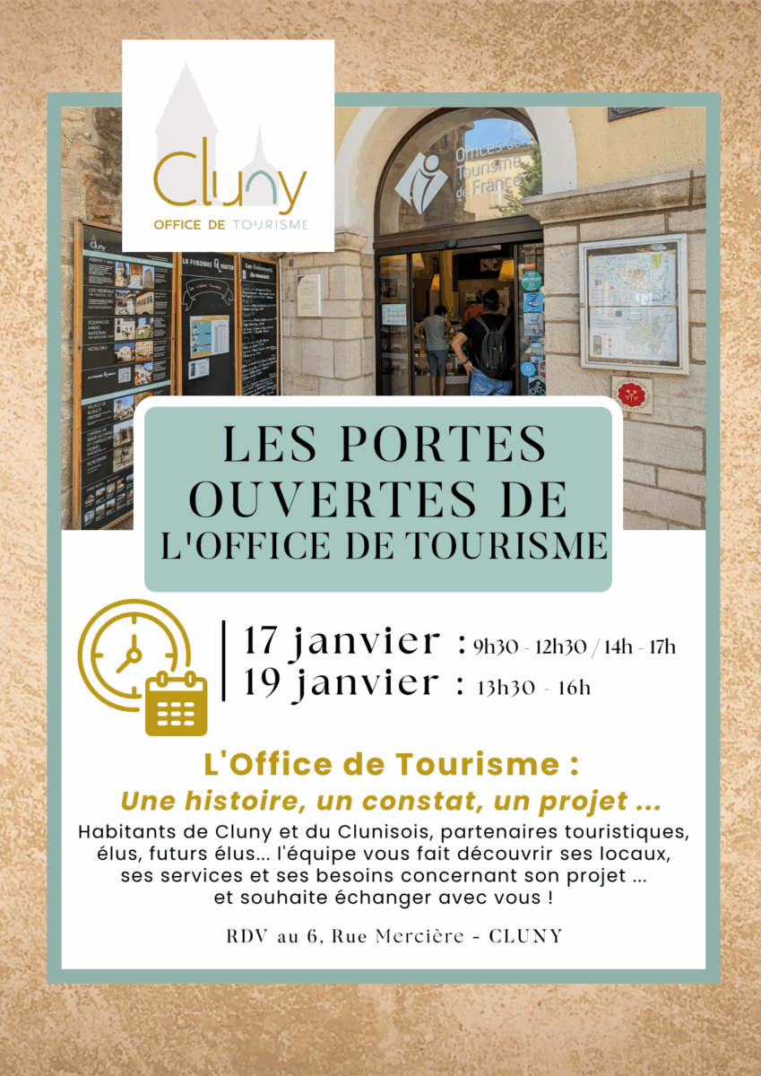 L’Office de tourisme de Cluny et du Clunisois ouvre ses portes aux habitants du territoire, aux partenaires touristiques et aux élus, les vendredi 17 et dimanche 19 janvier prochains, à Cluny.