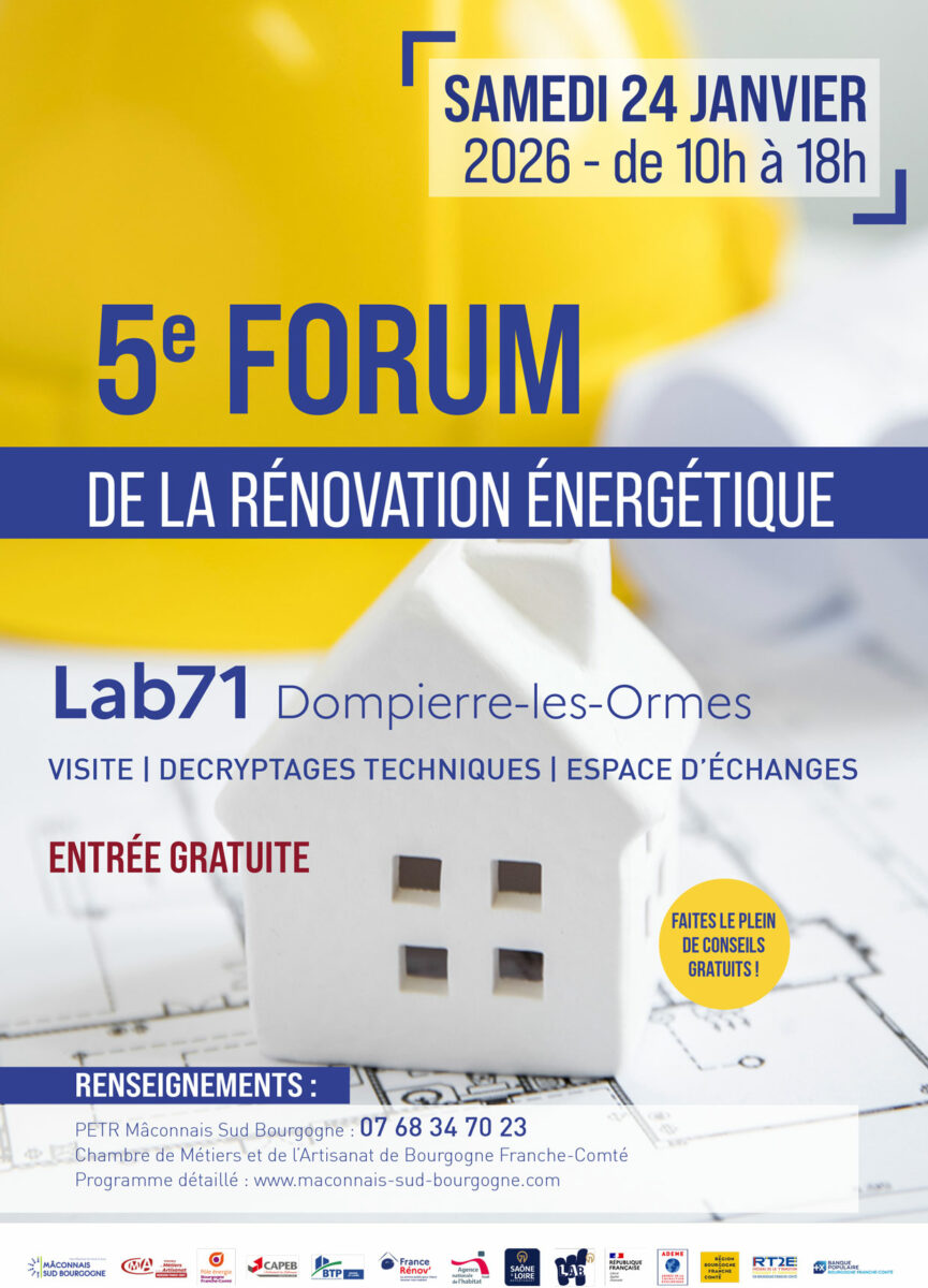 Le samedi 24 janvier 2026, le Lab71 à Dompierre-les-Ormes accueillera le 5ᵉ Forum de la rénovation énergétique, de 10h à 18h. Ouvert à tous et gratuit, cet événement s’adresse aux particuliers souhaitant engager ou approfondir un projet de rénovation de leur logement.