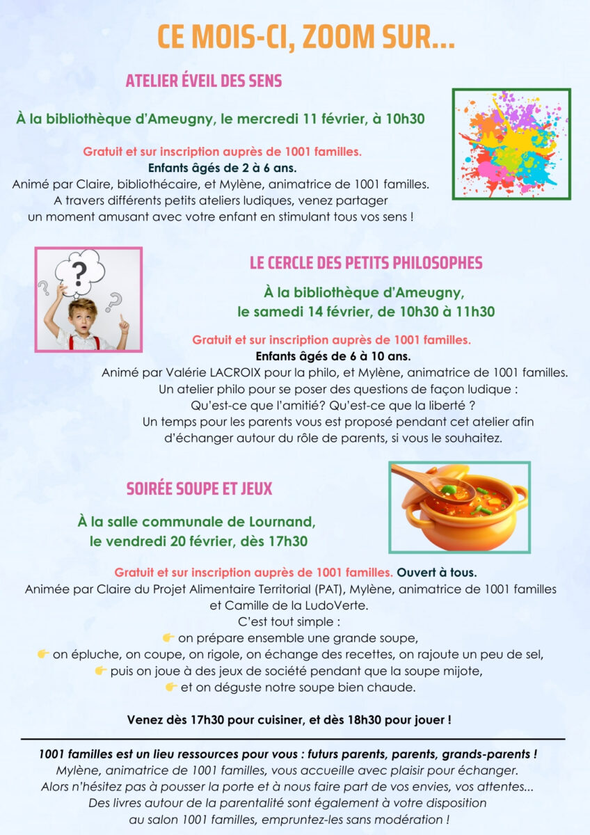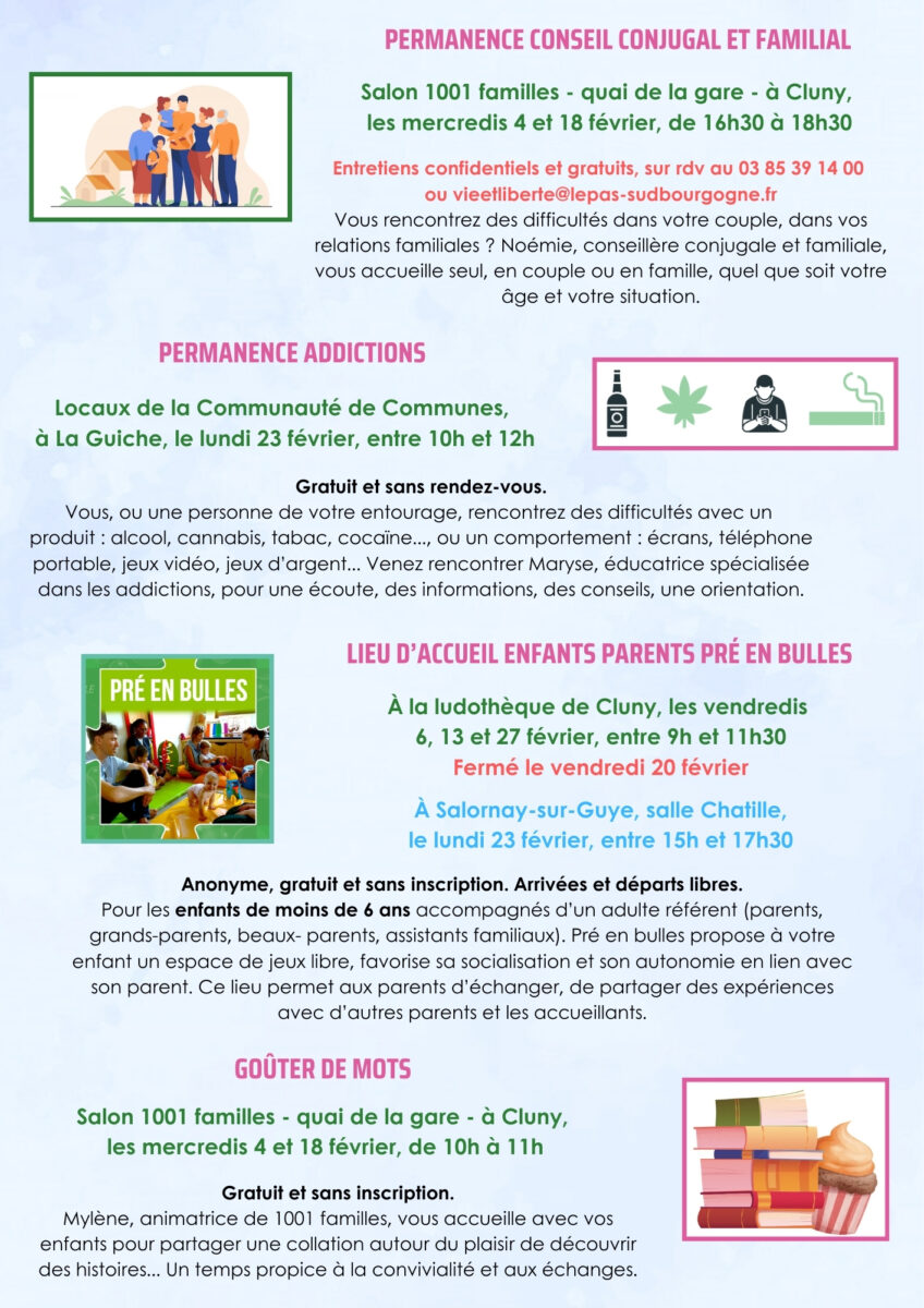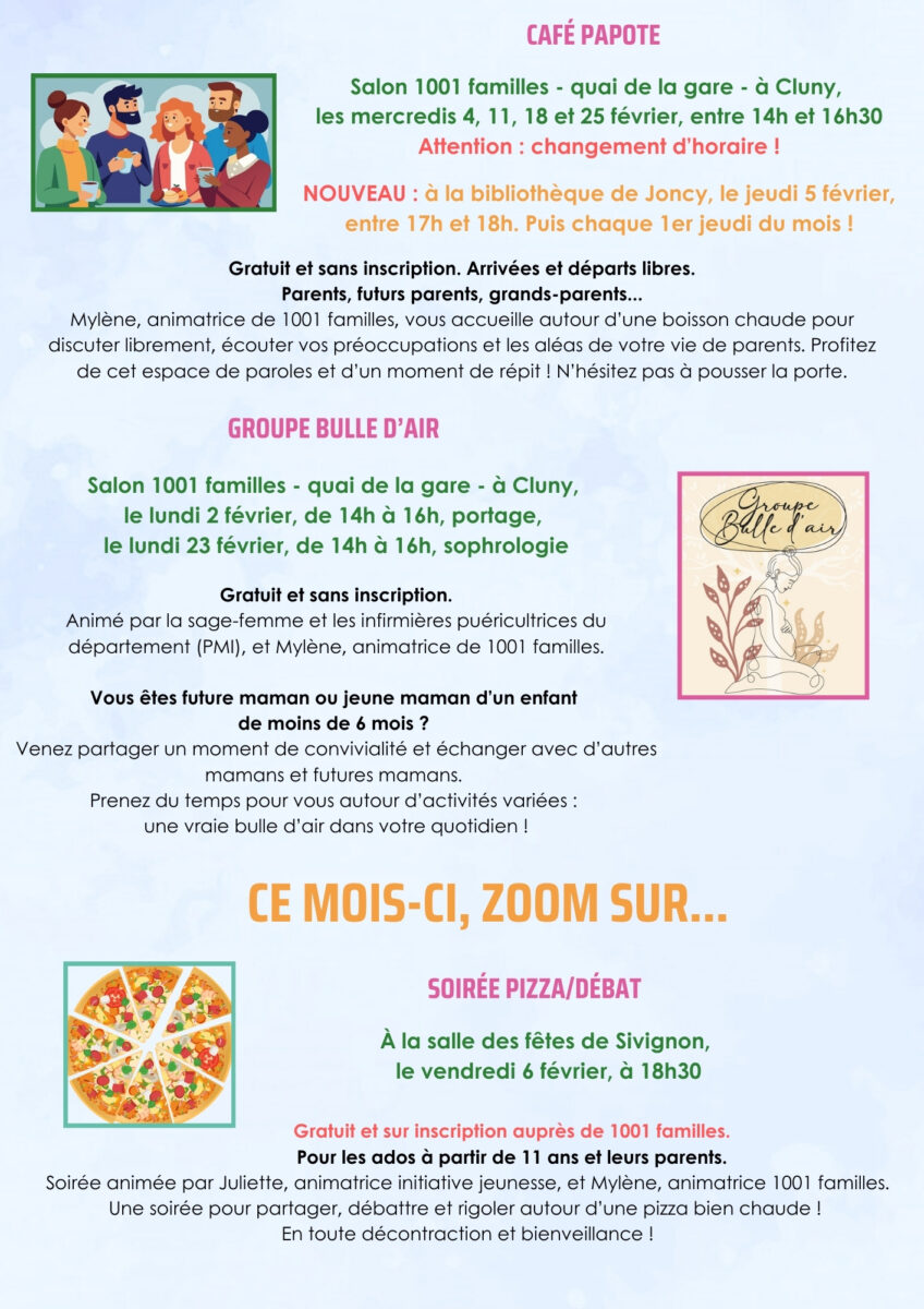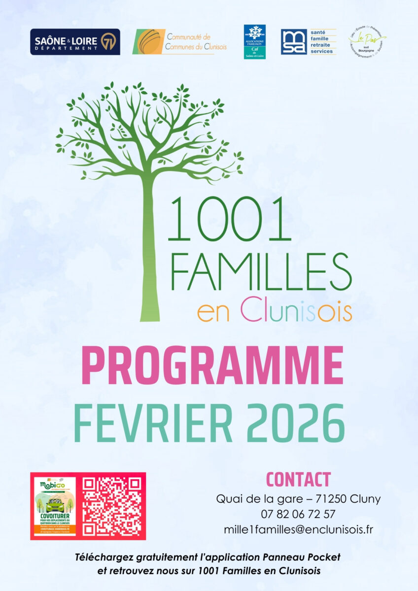 1001 Familles en clunisois, propose un éventail d’activités et de permanences pour les familles, les enfants et les jeunes du territoire. Voici le programme détaillé pour le mois de février 2026 :