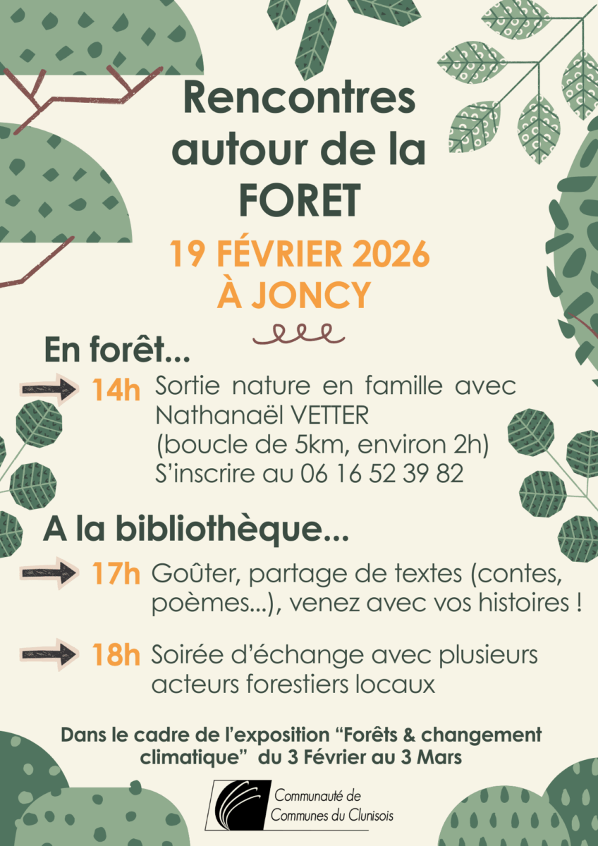 Dans le prolongement de l’exposition consacrée aux forêts et aux changements climatiques, une journée spéciale “Rencontres autour de la forêt” est proposée le mercredi 19 février à Joncy. Ouverte à toutes et tous, elle s’adresse aux habitants, curieux et passionnés souhaitant mieux comprendre les enjeux forestiers actuels.