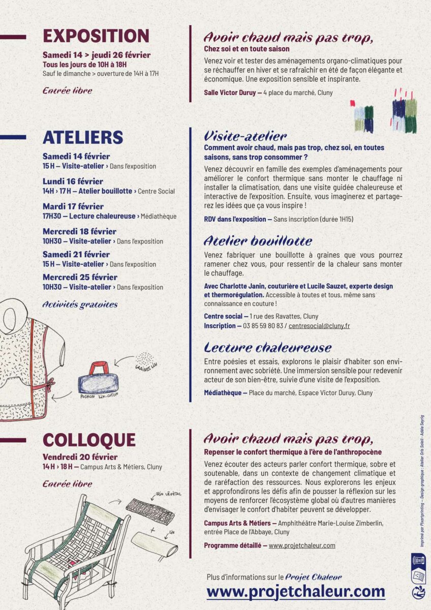 Du 13 au 26 février 2026 à Cluny, une exposition intitulée Avoir chaud mais pas trop invite le public à découvrir et tester des aménagements organo-climatiques pour chauffer et rafraîchir son intérieur de façon élégante, économique et respectueuse de l’environnement.