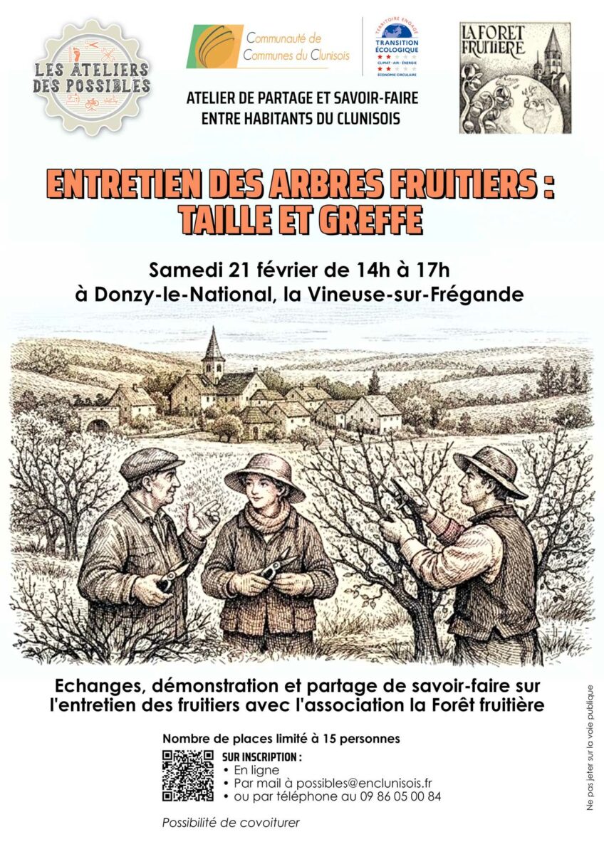 Dans le cadre des Ateliers des Possibles, temps de partage et de transmission de savoir-faire entre habitants du Clunisois, une animation dédiée à l’entretien des arbres fruitiers est proposée le samedi 21 février, de 14h à 17h, à Donzy-le-National (La Vineuse-sur-Frégande).