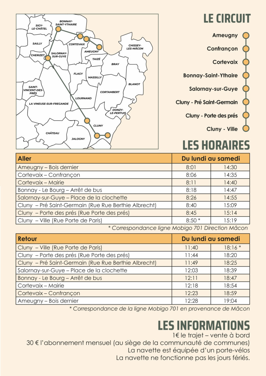 Depuis le lundi 16 juin 2025, la Communauté de Communes du Clunisois met en place un nouveau service de navette régulière pour relier plusieurs communes du territoire :